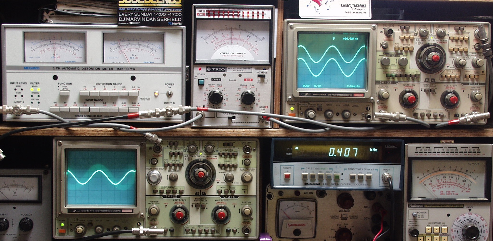 | E. 調整・測定 E1.調整・出力測定 <見方> 上左オーデオ発振器より400HZ・1KHZの信号を出す(歪み率=約0.003%) 下中=入力波形(オーデオ発振器のTTLレベル) 下右=周波数計 上左=SP出力の歪み率測定 左メ−タ−=L出力、右メ−タ−=R出力 上中=SP出力電圧測定器、赤針=R出力、黒針=L出力 上右=SP出力波形オシロ 上=R出力、下=L出力(出力電圧測定器の出力) |