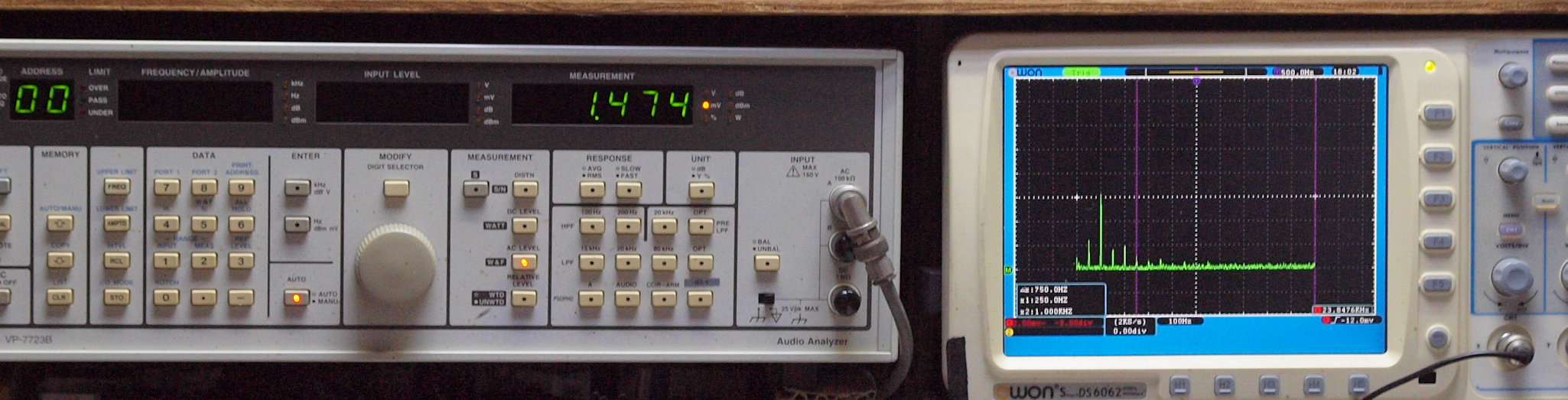 | T. バラック修理後測定。 画像をクリックすると、大きく(横幅2050ドット)表示されます。 T0. 出力・歪み率測定・調整、 100Vで測定。 「見方」。 上段中 右側SP出力を「Audio Analyzer Panasonic VP−7723B」により測定。 表示LED、 左端=メモリーNo、 中左=周波数測定、 中右=出力電圧測定、 右端=歪み率測定。 上段右端 VP−7723Bの基本波除去出力を「owon SDS8202(200MHZ)」で「FFT分析」表示。 下段中 左側SP出力を「Audio Analyzer Panasonic VP−7723B」により測定。 表示LED、 左端=メモリーNo、 中左=周波数測定、 中右=出力電圧測定、 右端=歪み率測定。 下段右端 VP−7723Bの基本波除去出力を「owon SDS6062(200MHZ)」で「FFT分析」表示。 下段左端 オーディオ発振器 VP−7201A より50Hz〜100kHzの信号を出し(歪み率=約0.003%)、ATT+分配器を通し、AMPに入力。 よって、ダイアル設定出力レベルより低くなります。測定機器の仕様や整備の様子はこちら、「VP−7723B」「VP−7201A」。 FFT画面の見方はこちら。 |