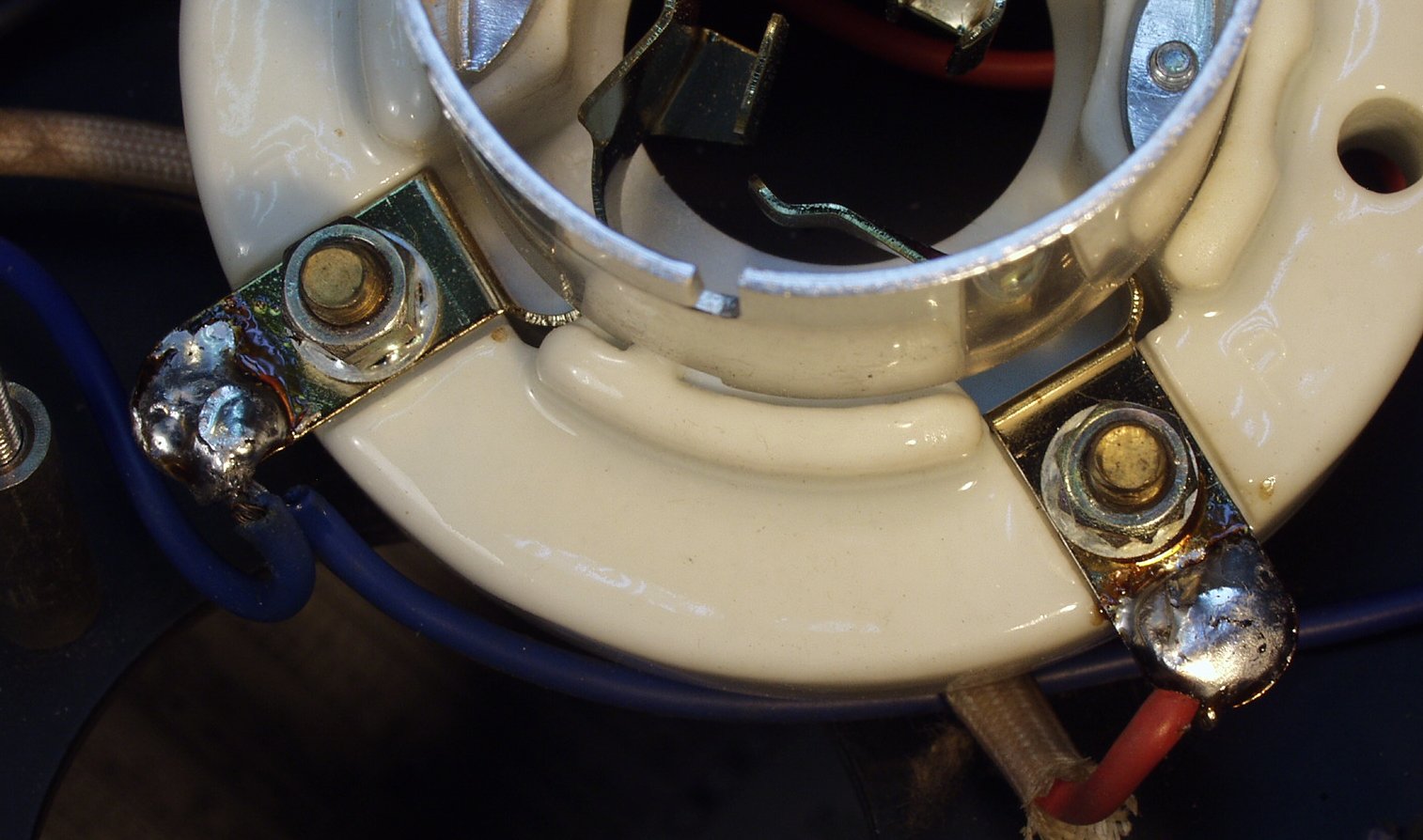 | CA.211ソケット修理前 配線は半田あげしてビス止め!、これでは熱で緩む 自作品では、完成すれば終わり、しかし製造メ−カ−はそれからが本当の仕事です 安全、経年変化、複合要素による発振等々の配慮 |