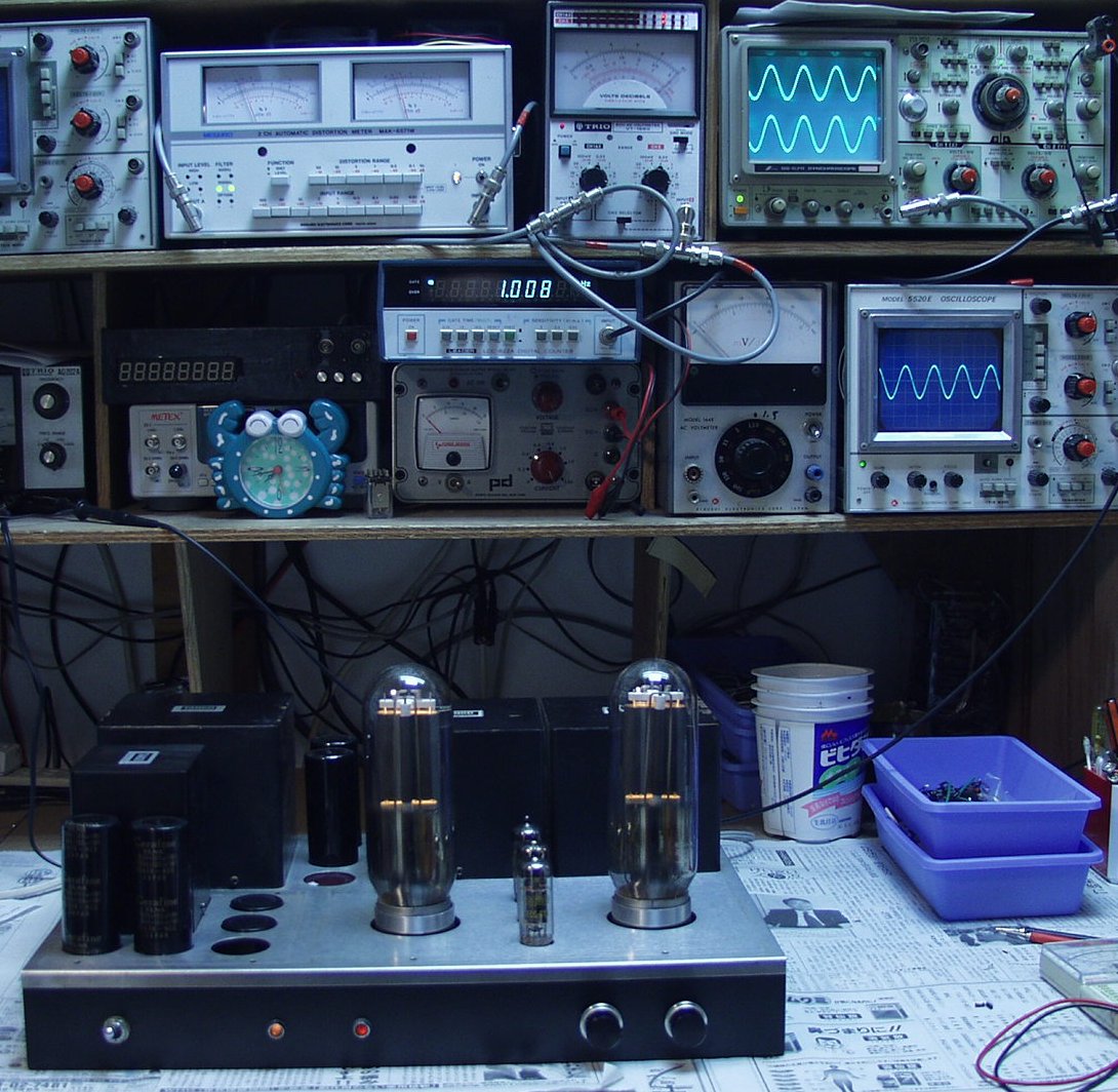 | E4.完成 24時間エージング 大型三極出力独特の音がする、「出力10V=12.5W 歪み率3%」の測定結果など、吹っ飛んでしまう! これが、真空管の魅力です。 聴いたことの無い人解るかな? 解からないだろうな! |