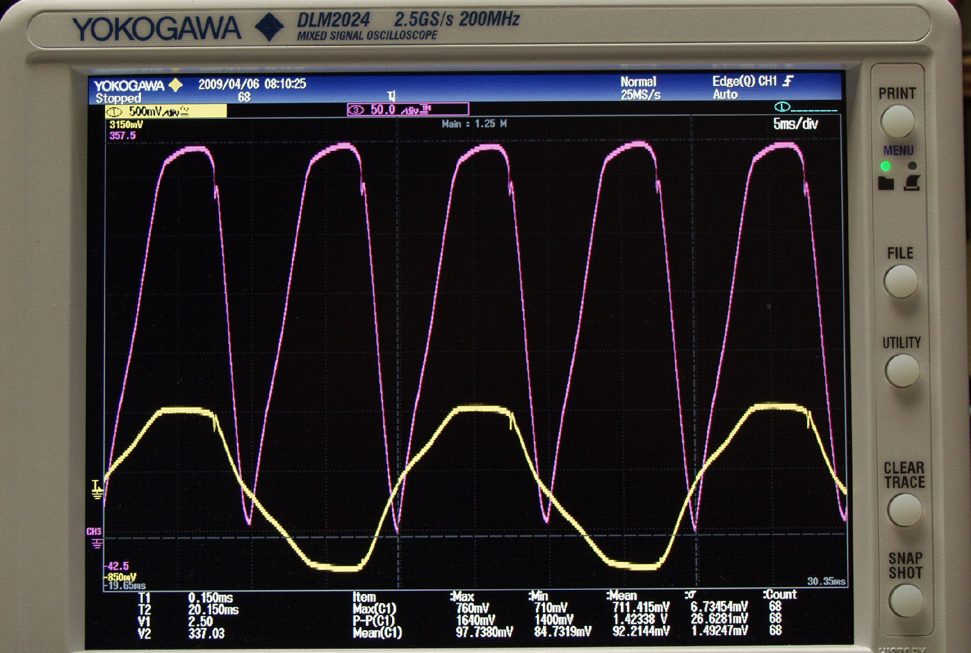 | U63. 付属ECC83「 V6」測定の入出力波形。 赤色=グリッド電圧、黄色=プレート電圧 | ||||||||||||||||||||||||||||
