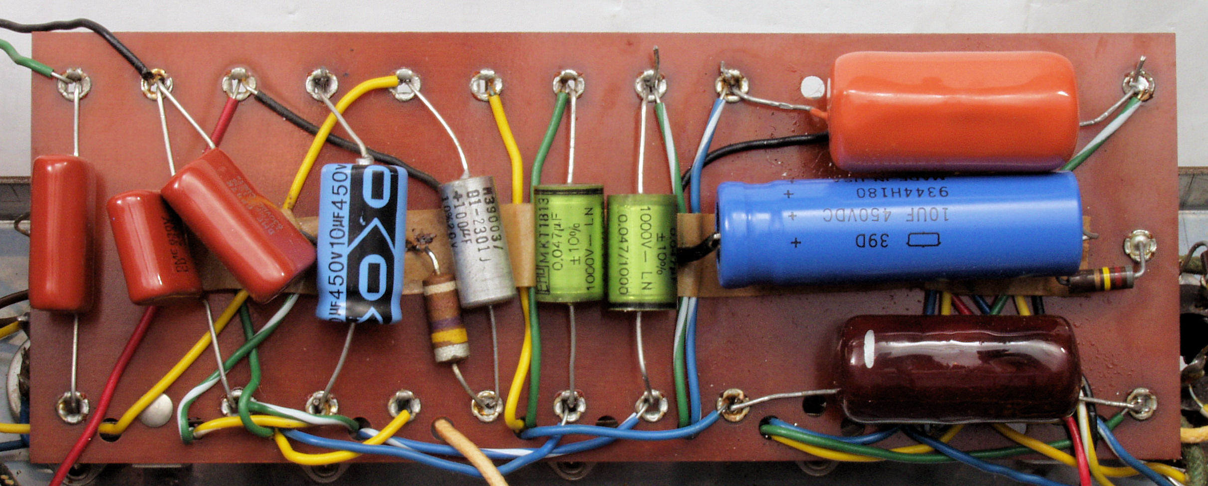 | A63. 点検中 交換された電解コンデンサー、リード線を取るのが大変なので、継ぎ足し! |
