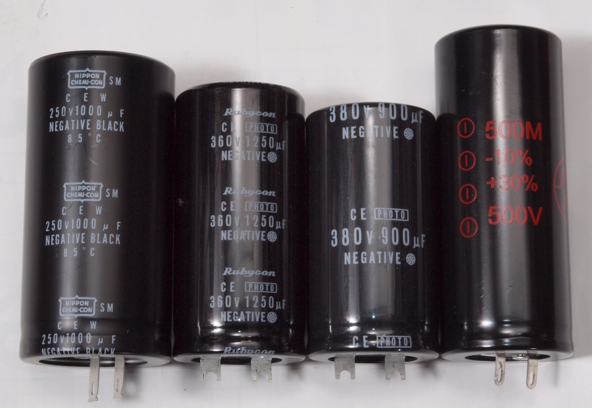 | A41. 点検中 倍電圧整流に使用する電解コンデンサー。 下記から選択可能。 左から 1000μ/250WV、 1250μ/360WV、 900μ/380WV、 500μ/500WV。 付いているのは 250μ/250WV。1000μ/250WV選択。 |