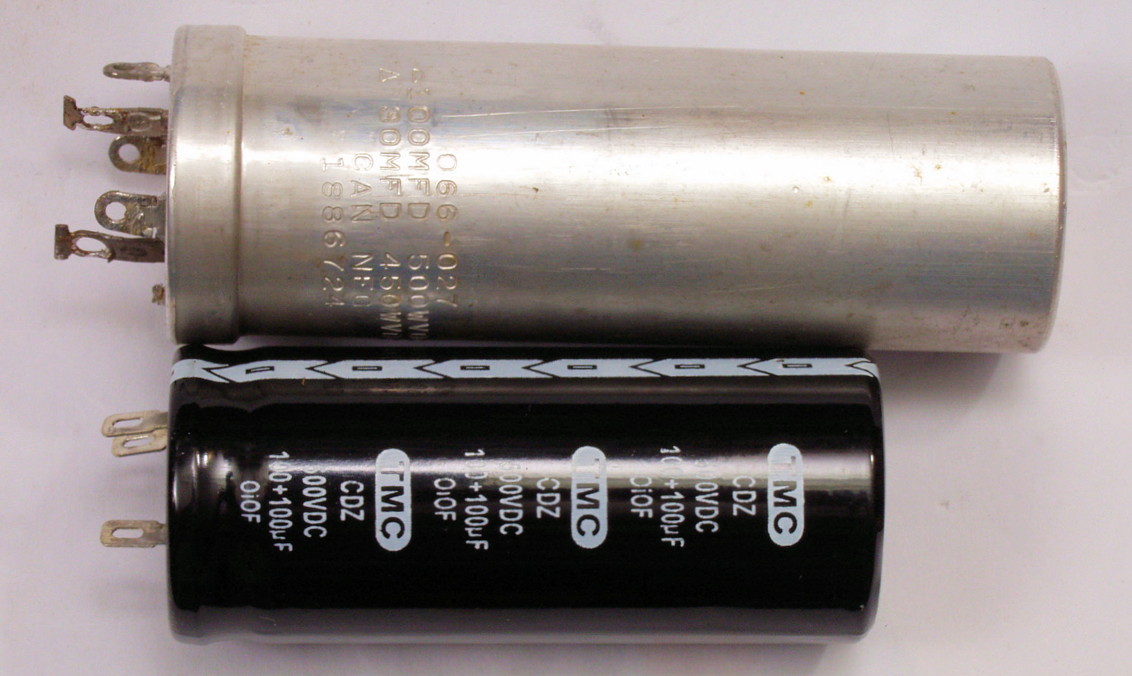 | A82. 点検中 整流用電解コンデンサーの比較、 上=付いている物(100μF/500WV+30μF/450WV))、下=交換する者(100μF×2/500WV)) |