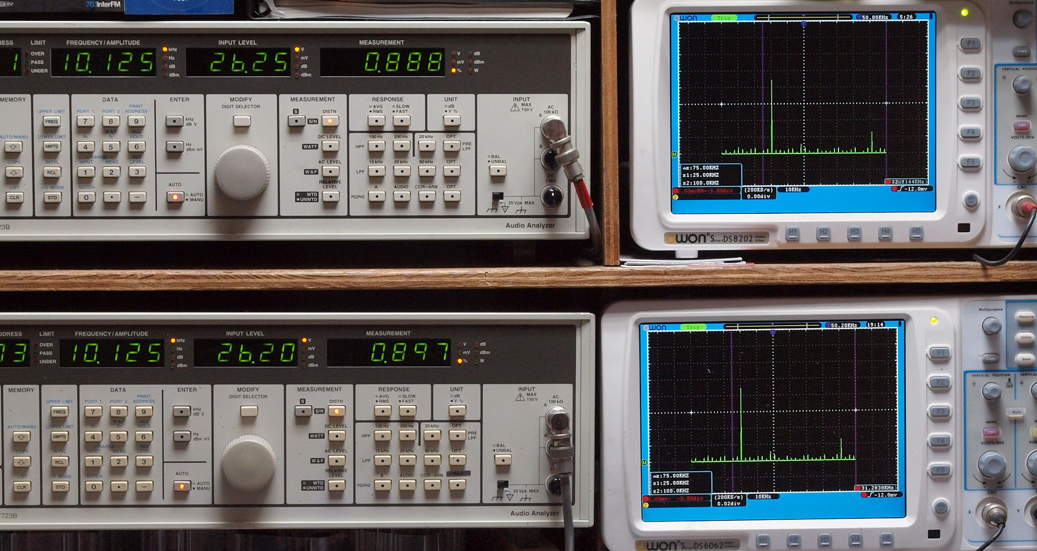 | E. 測定・調整。 画像をクリックすると、大きく(横幅2050ドット)表示されます。 E0. 出力・歪み率測定・調整、 100Vで測定。 「見方」。 上段中 右側SP出力を「Audio Analyzer Panasonic VP−7723B」により測定。 表示LED、 左端=メモリーNo、 中左=周波数測定、 中右=出力電圧測定、 右端=歪み率測定。 上段右端 VP−7723Bの基本波除去出力を「owon SDS8202(200MHZ)」で「FFT分析」表示。 下段中 左側SP出力を「Audio Analyzer Panasonic VP−7723B」により測定。 表示LED、 左端=メモリーNo、 中左=周波数測定、 中右=出力電圧測定、 右端=歪み率測定。 下段右端 VP−7723Bの基本波除去出力を「owon SDS6062(200MHZ)」で「FFT分析」表示。 下段左端 オーディオ発振器 VP−7201A より50Hz〜100kHzの信号を出し(歪み率=約0.003%)、ATT+分配器を通し、AMPに入力。 よって、ダイアル設定出力レベルより低くなります。測定機器の仕様や整備の様子はこちら、「VP−7723B」「VP−7201A」。 FFT画面の見方はこちら。 |