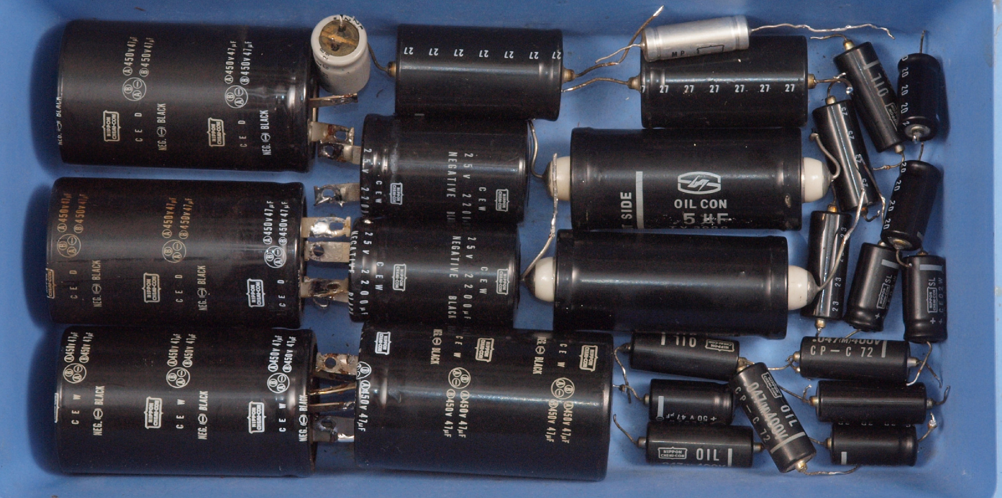 | CB4. 交換部品、低圧ブロック電解コンデンサー。 左=2200μ×2/25WV、右=新しい物4700μ×2/50WV。 |