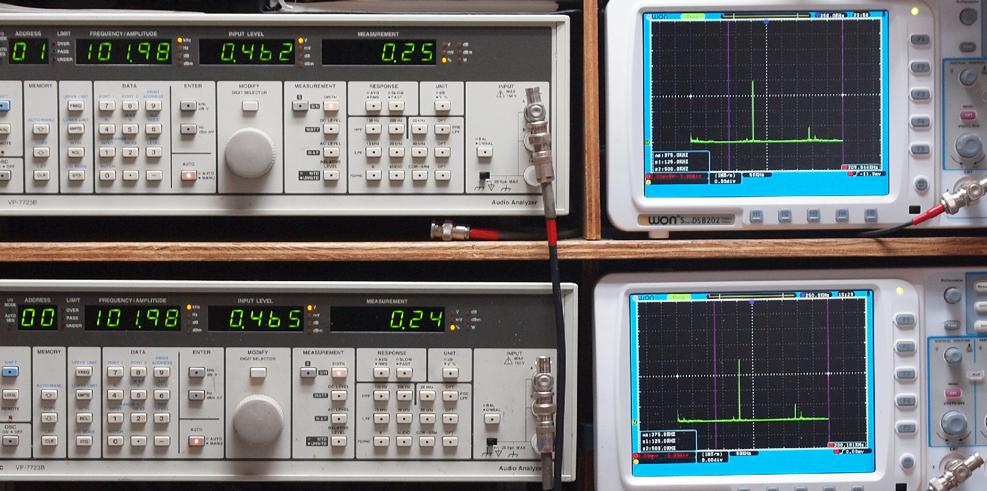 | T. バラック修理で測定 T0. 出力・歪み率測定・調整。 「見方」。 上段中 右側出力を「Audio Analyzer Panasonic VP−7723B」により測定。 表示LED、 左端=メモリーNo、 中左=周波数測定、 中右=出力電圧測定、 右端=歪み率測定。 上段右端 VP−7723Bの基本波除去出力を「owon SDS8202(200MHZ)」で「FFT分析」表示。 下段中 左側出力を「Audio Analyzer Panasonic VP−7723B」により測定。 表示LED、 左端=メモリーNo、 中左=周波数測定、 中右=出力電圧測定、 右端=歪み率測定。 下段右端 VP−7723Bの基本波除去出力を「owon SDS6062(200MHZ)」で「FFT分析」表示。 下段左端 オーディオ発振器 VP−7201A より50Hz〜100kHzの信号を出し(歪み率=約0.003%)、ATT+分配器を通し、AMPに入力。 よって、ダイアル設定出力レベルより低くなります。測定機器の仕様や整備の様子はこちら、「VP−7723B」「VP−7201A」。 FFT画面の見方はこちら。 |