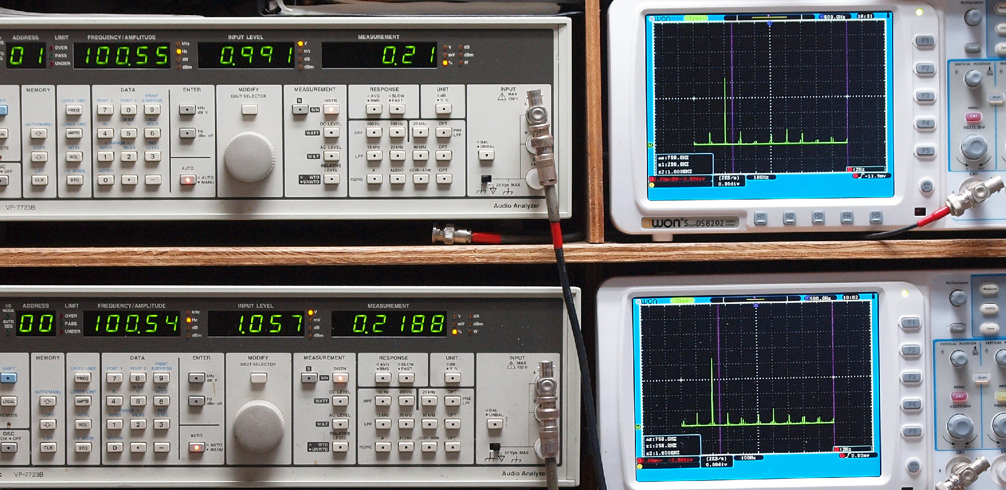 | E. 調整・測定 E1. 出力・歪み率測定・調整。 「見方」。 上段中 右側出力を「Audio Analyzer Panasonic VP−7723B」により測定。 表示LED、 左端=メモリーNo、 中左=周波数測定、 中右=出力電圧測定、 右端=歪み率測定。 上段右端 VP−7723Bの基本波除去出力を「owon SDS8202(200MHZ)」で「FFT分析」表示。 下段中 左側出力を「Audio Analyzer Panasonic VP−7723B」により測定。 表示LED、 左端=メモリーNo、 中左=周波数測定、 中右=出力電圧測定、 右端=歪み率測定。 下段右端 VP−7723Bの基本波除去出力を「owon SDS6062(200MHZ)」で「FFT分析」表示。 下段左端 オーディオ発振器 VP−7201A より50Hz〜100kHzの信号を出し(歪み率=約0.003%)、ATT+分配器を通し、AMPに入力。 よって、ダイアル設定出力レベルより低くなります。測定機器の仕様や整備の様子はこちら、「VP−7723B」「VP−7201A」。 FFT画面の見方はこちら。 |