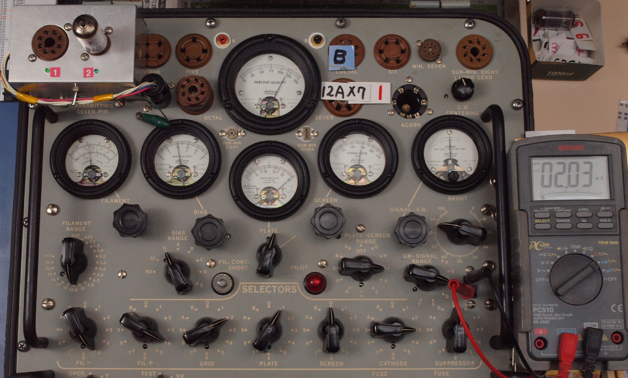 | U41. 付属B1本目「12AX7」 ユニット1。 Gm測定=2300μmho、IP=2.03mA。 Cレンジ=3000μmhoレンジでの測定、「Ep=250V、Eg1=−2V」 |