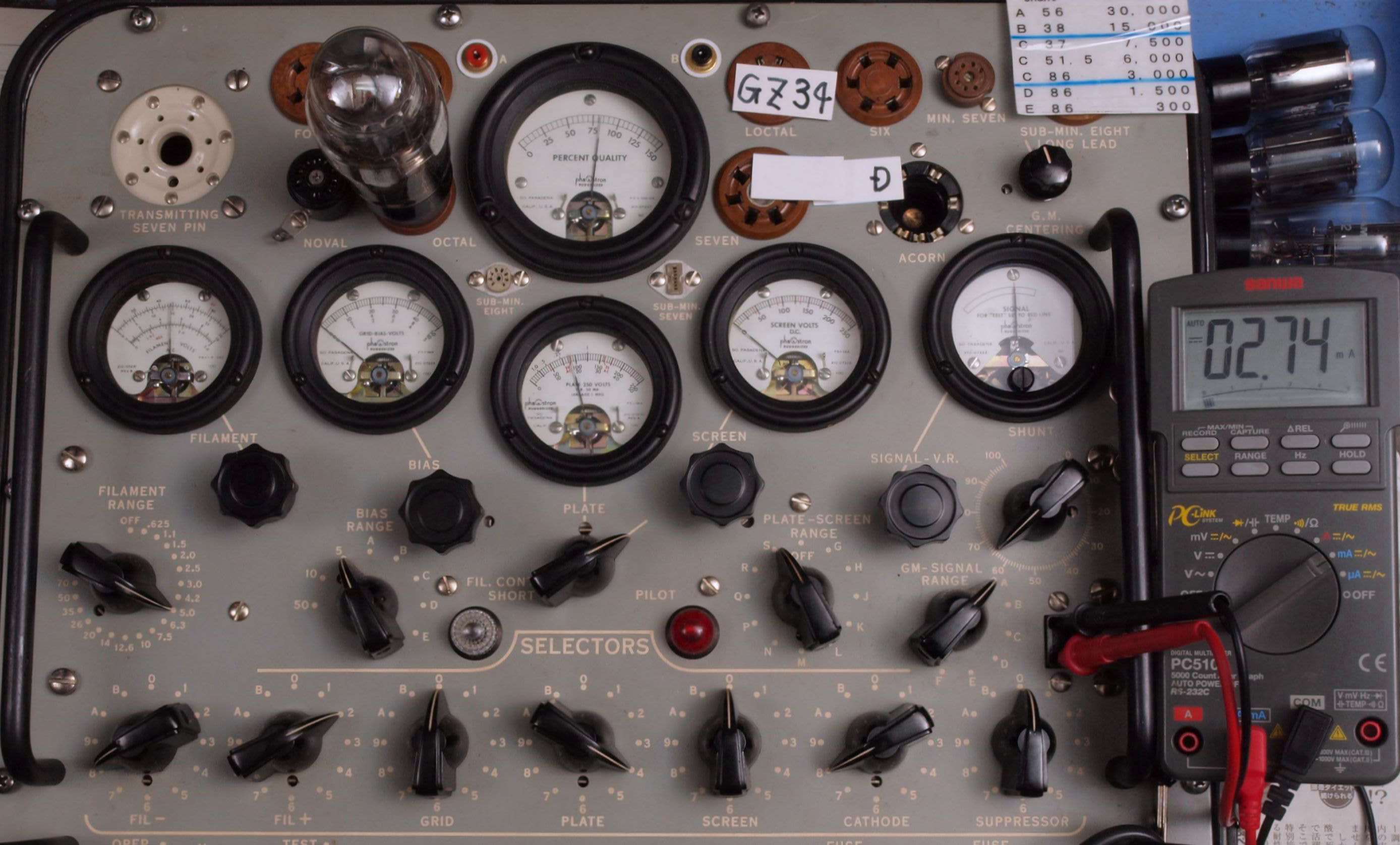 | U. TubeTester HickokTV−2B/Uによる付属真空管測定 。 真空管ハンドブック(規格表)の、 6267(EF86)相互コンダクタンス=2000μmho「Ep=250V、Ip=3mA、Esg=140V、Eg1=−2V」。 KT66相互コンダクタンス=6300μmho「Ep=250V、Esg=250V、Ip=85mA、Eg1=−15V」。 1960/1962/1964/1966ナショナル真空管ハンドブック、1995オーディオ用真空管マニアル、60/62/69東芝電子管ハンドブック、1962日立電子管ハンドブック、1965/1971全日本真空管マニュアル、RC15/19/26/27/28/29/30 Receiving Tube Manual、1966/実用真空管ハンドブック、1995世界の真空管カタログより。 5GK4(5AR45)エミション測定=VacuumTubeTester Hickok TV-2B/U の「5U4」検査方法による、破棄値=75。 |
