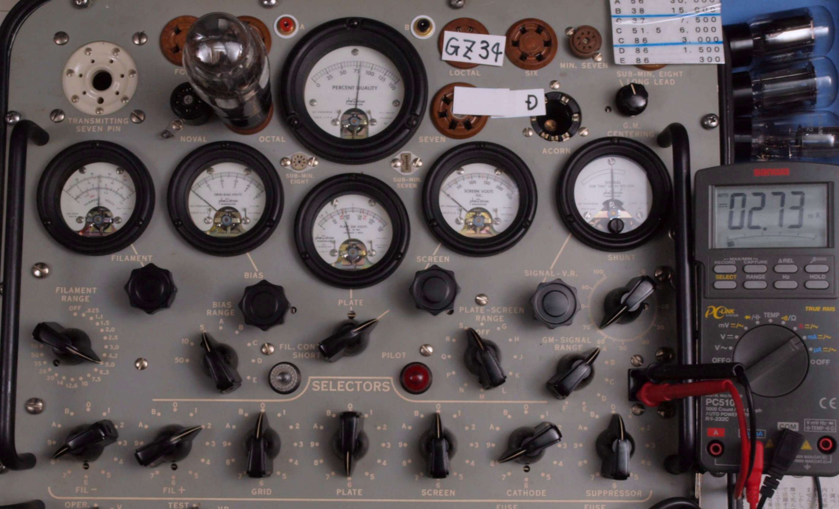 | U32. 付属「GZ34(5AR4)」ユニット2 エミション測定=80、Ip=2.73mA。 Vacuum Tube Tester Hickok TV-2B/U の「5U4」検査方法による、破棄値=75。 |